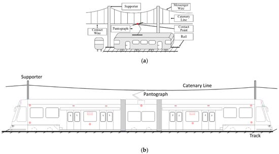 The prototype of a light rail vehicle. (a) Pantograph–catenary system components; (b) lumped-mass model. Reprinted with permission from ref. [18]. Copyright 2016 IEEE.