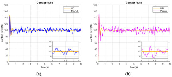 The contact force regulation performance. (a) The contact force for T1AFLC and the proposed IT2AFLC. (b) The contact force for passive control and the proposed IT2AFLC.