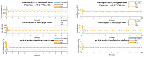 Two different sets of the different and are simulated and analyzed as follows. The contact force regulation performance for IT2AFLC with different three TR methods are almost the same, as shown in Figure 9. Similarly, the vertical position, speed, and acceleration of the pantograph head and frame are definitely the same as those demonstrated in Figure 10 and Figure 11, respectively. Finally, the simplified IT2 algorithm uses larger dynamic uplift force than the proposed MZL algorithm and the KM algorithm, as illustrated in Figure 12.