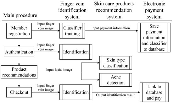 The main architecture of this work is composed of a finger-vein identification system, a skincare products’ recommendation system, and an electronic payment system, as shown in Figure 1. The first subsystem is the finger-vein recognition system, which is used as identity verification and a personalized service. The second subsystem is the skincare products’ recommendation system, which provides consumers with professional skin analysis through skin type classification and acne detection to improve skin issues of consumers and recommends skincare products finally. The third subsystem is the electronic payment system, which provides a variety of checkout methods, and the system will check out by finger-vein connections according to membership information.