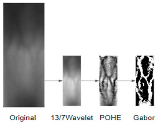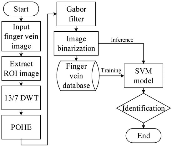 When the finger is irradiated with near-infrared light (NIR), the hemoglobin in the venous red blood cells absorbs the near-infrared light and presents a shadow. Based on this principle, the near-infrared vein image can be obtained. Finger-vein identification method has the characteristics of being contactless, fast, and stable as well as satisfying the conditions of hygiene, real time, and correctness simultaneously, making users have a better experience. The flowchart of the finger-vein recognition system is shown in Figure 2. The system first uses 13/7 discrete wavelet transform (DWT) [] to reduce the dimensionality of the infrared image captured by the raspberry pi camera, retaining the features while shrinking the image, thereby improving computation speed. Then, parametric-oriented histogram equalization (POHE) [] is used for image enhancement to solve the issue of difficult extraction of features due to light sources, making subsequent features easier to extract. Finally, it uses Gabor filters [,] to extract vein features to input the data into the SVM model for training. The system can use a pre-trained model to efficiently and quickly complete membership registration or identification.