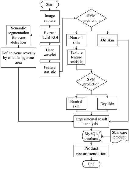 The skincare products’ recommendation system is divided into two parts: skin type classification and acne detection. It is implemented by combining multi-feature processing with the ML classification technology and the DL semantic segmentation [] technology. Finally, according to the analysis of skin type and acne status, facial skincare products are recommended to consumers. The flowchart of the skincare products’ recommendation system is shown in Figure 4.