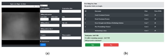 As shown in Figure 8a,b, the user must fill in the payment method and other information and complete the operation of photographing finger-veins. After the first registration, if the payment method inquiry is not turned on in future purchases, payment can be made through vein authentication without filling in any information. The payment method can be changed through the membership system.