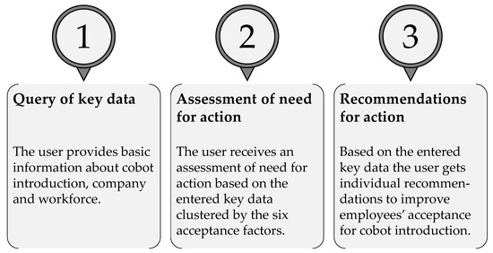 At the beginning of the employee acceptance tool the user is provided with information about possible consequences of missing acceptance, such as productivity losses due to employees actively undermining the cobot introduction process, manipulating the cobot itself or refusing to use it. Dissatisfaction and lower motivation among employees are further possible negative effects of a lack of acceptance. Afterwards, the user gets informed about the following process flow of the tool, that is the (1) query of key data about the potential cobot use case and company characteristics, followed by (2) an assessment indicating crucial acceptance issues and corresponding needs for action, and (3) individual recommendations based on this assessment (see Figure 1).