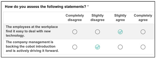 The queried key data are subsequently used to assess the need for action clustered by the six acceptance factors. Depending on the selected option for each question, a value between −2 and +2 is assigned as a basis for determining the need for action (see Section 3.2), with −2 representing a high and +2 a low risk for employee acceptance. Whenever available, we used validated, balanced verbal labels for the scales to query the basic data. For standardised five-level metric scales, we removed the middle rating to prevent users from dodging the decision. For example, when asking users to agree or disagree with statements, we used completely disagree, slightly disagree, slightly agree, and completely agree (see Figure 2), which were assigned to the scores (−2), (−1), (+1), and (+2), respectively. When no validated labels existed with respect to some cobot-specific questions, we were forced to assign the scores to the corresponding response options based on logical considerations. The translation of the given answers into these scores is indiscernible for users.