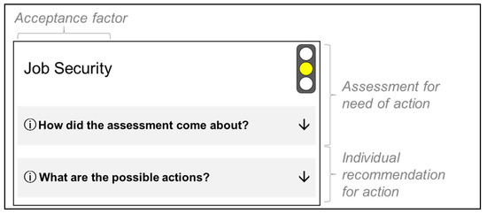 After assessing the needs for action, the user receives recommendations on how to increase employee acceptance in the introduction process of cobots (see Figure 3). Some generic recommendations are independent of the chosen answers in phase 1. For example, within the category perceived occupational safety users are recommended to provide the employees room for experimentation with the cobot in the run-up to the actual implementation. This enables them to test the integrated safety mechanisms and to gather initial practical experience, so that anxieties are reduced and confidence in working with the cobot is enforced [5,51]. In addition, further generic recommendations suggest users to avoid being guided by stereotypes, to delegate responsibility to employees and express their appreciation towards them [55], to involve them in the introduction process, to give them enough time to settle in, and to communicate the objectives of the introduction in a timely and transparent manner [48,53,55].