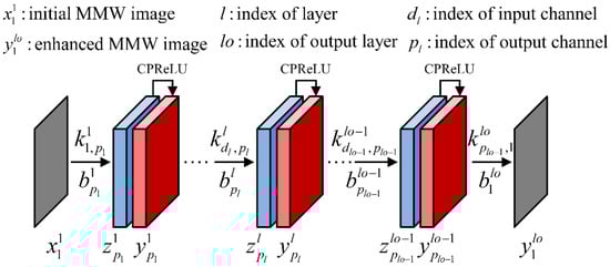 where , . For the layer, , the numbers of input and output channels are and , respectively. Here, represents the input feature map with a size of , denotes the convolution kernel, and is a bias. The symbol “” indicates a valid convolution, and denotes the result of a multichannel summation with bias, where and . “Re” and “Im” indicate calculations of the real and imaginary parts of the complex variables, respectively. If we assume that the feature map size of each layer remains the same, the input should be zero-padded.
