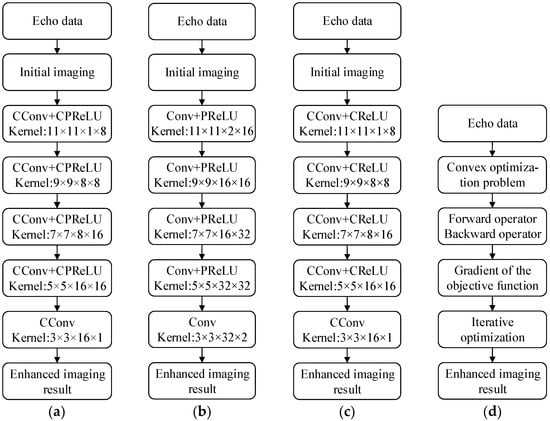 Structures of enhanced MMW 3-D imaging: (a) the proposed CVFCNN (CPReLU); (b) RVFCNN (PReLU); (c) CVFCNN (CReLU); (d) operator-based CS.