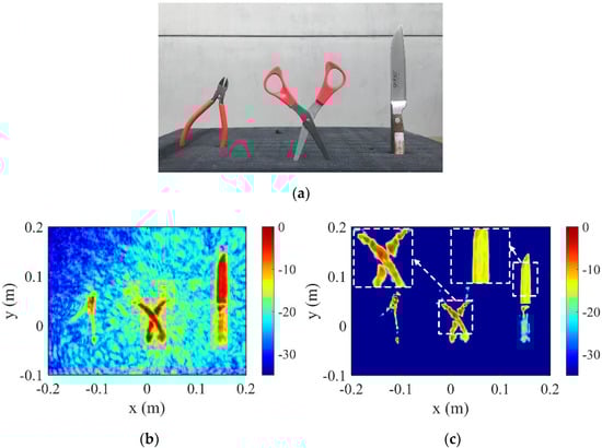 Millimeter-wave (MMW) imaging is widely applied in remote sensing [1,2], indoor target tracking [3], concealed weapons detection [4,5], and so on. It offers high spatial resolutions of the target under test, even behind some kind of barrier. In the past few decades, the regularized iterative methods, especially compressive sensing (CS)-based methods [6,7,8], have been widely employed to improve the image quality. In most cases, solving such ill-posed inverse problems leads to high computational complexity and unstable recovered results. Thus, the parameters of the CS method need to be carefully selected.