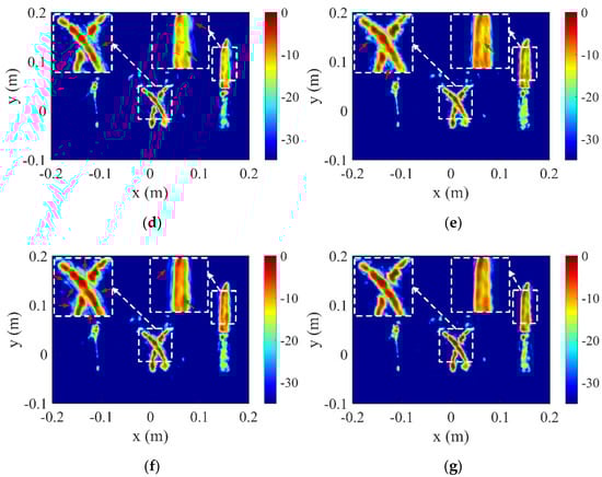 Here, we present experiments on the real measured data by a Ka band system operating at 32~37 GHz, as shown in Figure 5. The wide-band linear array forms a 2-D aperture through mechanical scanning. The parameters for the measured data are provided in Table 5. The measured targets are located at different distances from the antenna array, as shown in Figure 6a. The 2-D images are obtained through the maximum value projection of the 3-D results. Figure 6b demonstrates the imaging result of the PSM, using only 50% of the full data. Figure 6c illustrates the result of the CS method after repeated artificial parameter optimization. It can be seen that in order to suppress the aliasing artifacts and sidelobes of the image, the amplitudes of the targets are weakened; the parameters of the CS algorithm need to be adjusted according to the states of the scenes and the objects. Figure 6d–g shows the results of the CNN methods. Note that the CNN methods can achieve better results than the traditional PSM algorithm and perform competitively with the CS method or are even better, especially for the amplitude maintenance of the image. More importantly, CNN methods have strong robustness in terms of different objects and scenes in the testing stage. In regard to the CNN methods, as indicated by the green arrows, the amplitudes of the knife blade of CPReLU1 (Figure 6f) and CPReLU2 (Figure 6g) are more uniform than those of PReLU (Figure 6d) and CReLU (Figure 6e). Note from the detailed subfigures that the result of the proposed CPReLU2 in Figure 6g exhibits lower sidelobes than the results in Figure 6d–f, respectively, wherein the sidelobes are indicated by red arrows. The experimental results show that the proposed CPReLU2 performs best of the tested methods.