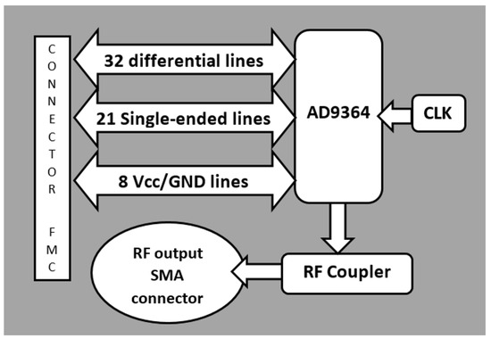 Schematic design of the RABE. This figure shows how AD9364 is connected to the FMC connector, as well as the FPGA and RF Output to the power amplifier stage (not shown at this work).