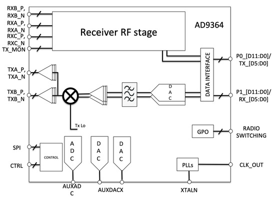 The RF stage of the RABE prototype uses the AD9364 transceiver, internally composed of ADC converters, DACs, filters, GPOs, PLLs, and an SPI communication control ports [12], as illustrated in Figure 5.