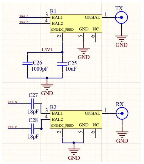 To reduce transients while changing the transmission frequency setting on the device, the power to the matching stage on the transmission lines is directly connected to a 1.3 V voltage source. The capacitors, shown in Figure 6, are intended for removing noise and transients at the transmitter output.