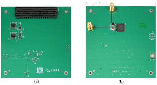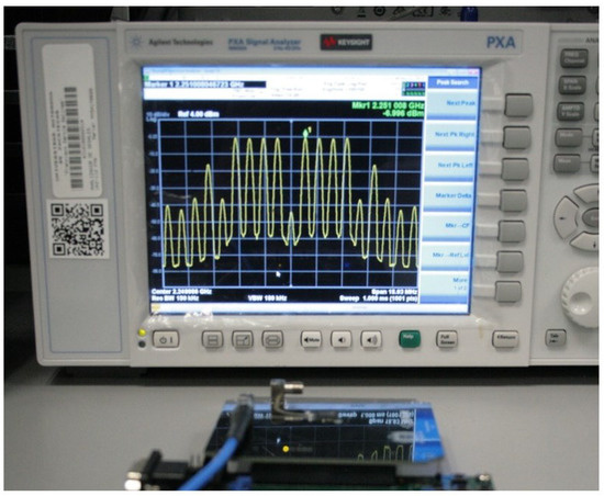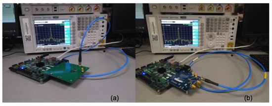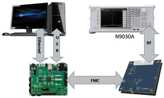 Using the configuration described in Section 2.3, the testbed was implemented to test the RABE prototype, obtaining similar results to those from the IC manufacturer’s test card AD9364 [12].