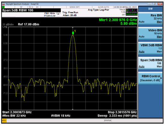 In Figure 10, the graph of the data collected in the test bench shows the spectrum transmitted by a signal with a carrier frequency of 2.6095 GHz to verify the correct operation of the design in different frequencies. The spikes shown at 2591 and 2599, are unidentified carriers external to the prototype system. The output power available at the carrier frequency in Figure 10 was −20 dBm, as shown. A Gaussian 3 dB resolution bandwidth (RBW) filter was applied into the signal analyzer followed by a Fast Fourier Transform (FFT) with a BW of 411.9 kHz.