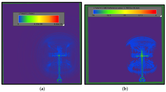 The simulation was carried out taking into account the Transmission Lines (TL) designed on the RABE prototype PCB towards the RF output. The near field for the present prototype is defined as maximum (wavelength). To perform the simulations, the frequency was defined at 2.3 GHz; therefore, the radiation levels emitted by the TL for the field can be seen in Figure 13a and for the field in Figure 13b.