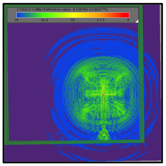 With the simulations of the and fields, the Poynting vector can be obtained, as can be seen in Figure 14, where gives the measure of rate of energy flow per unit surface area at a point in a uniform plane wave.