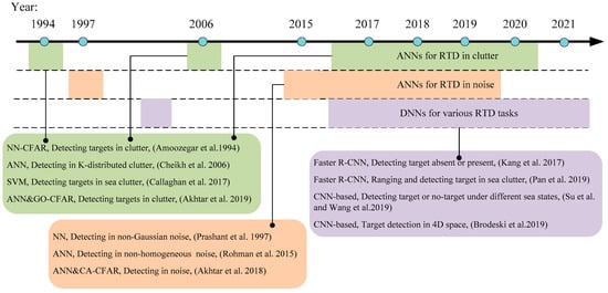 Radar Signal Processing is an intermediate procedure between radar sensing and ATR. One of the most important purposes of radar signal processing is to detect targets. Machine learning-based classifiers algorithms, such as support vector machines (SVM) [42] and k-Nearest-Neighbour (kNN) [43], have been used for RTD [44,45]. As previously mentioned, RTD is a binary hypothesis testing which can be regarded as a binary classification problem, namely whether the target is present or absent. Based on this assumption, RTD can be regarded as an ATR application. As deep learning models have achieved good performance in ATR, it is feasible and reasonable to explore deep learning-based models in RTD. As one of the most reliable classifiers, ANN has been utilized to improve radar detection performance [46,47]. Many recent literatures utilize DNN to tackle RTD and also present performance improvements. Figure 2 illustrates the major developments and application of deep learning in RTD. Detailed descriptions of each algorithm will be presented later.