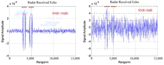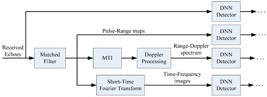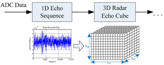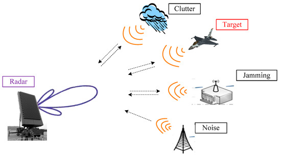 In a complex scenario of RTD, radar echo signals are often immersed in noise, jamming and clutter, etc., which is shown in Figure 3. During the typical pulse Doppler radar signal processing, the reflected radar signals are processed by a series of methods such as matched filtering, coherent accumulation, clutter suppression, CFAR detection, etc.