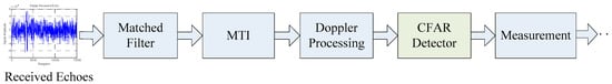 The received radar signals are sampled at a certain rate, and the pulses are compressed by the matched filter to obtain high range resolution and narrow pulse width. Moving target indication (MTI) is performed to suppress static clutter. Then, Doppler processing or coherent accumulation is applied over multiple pulses at each range unit to obtain the Range-Doppler spectrum. The reflected signal amplitude for each Range-Doppler is stored in separate cells, after which the CFAR detector is utilized to reveal one whose amplitude exceeds the threshold of detection. Thus, the corresponding information about velocity and position can be measured. The flowchart is presented in Figure 4.