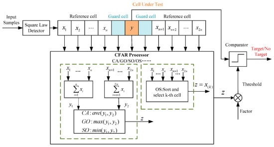In order to find an adaptive detection threshold, many CFAR-based methods have been studied, which can adapt the threshold to the background changes, keeping a constant . The diagram of typical CFAR processors is also showed in Figure 5 [49].