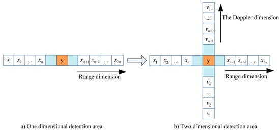 Compared with one-dimensional range detection, two-dimensional detection under phase-coherent accumulation includes range and Doppler detection, which is presented in Figure 6. denotes the reference cells of range dimension, denotes the reference cells of the Doppler dimension. The detection process of Doppler dimension is the same as that of range dimension.