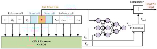 In order to improve the detection performance of radar a in non-homogeneous environment, in 2015, Rohman et al. [59] presented a novel adaptive switch between the CA-CFAR and OS-CFAR detector by using the ANN structure with MLP which consisted of 2 hidden layers. The proposed architecture is illustrated in Figure 8. The inputs of ANN were calculated thresholds and the CUT value and the output was a preliminary threshold. Then, the nearest value between raw threshold and CA or OS-CFAR would be selected and utilized as the final threshold. The experiment’s results showed that the combined approach is capable of switching between CA-CFAR and OS-CFAR properly in homogenous and non-homogeneous environments based on the best detection performance.