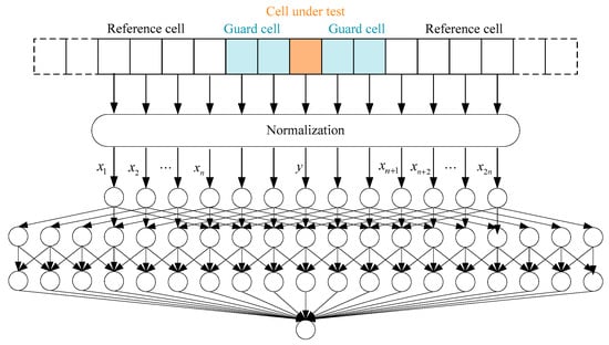 However, because the characteristics of clutter highly rely on the actual environment and the parameters of radar, the above extracted parameters or features often become ineffective when the detection environment changes. Compared with machine learning methods which need to empirically select features, ANN is more suitable for extracting high-dimensional features, and has been adopted as a method of radar signal detection [88]. Following on from this work, Cheikh and Soltani [62] used different ANN architectures to assess the problem of RTD in a K-distributed clutter with thermal noise. They considered the MLP architecture with the genetic algorithm and back-propagation as the training methods, and the radial basis function (RBF) which has been largely used in signal processing was also adopted in the neuronal detector. A training set was used which can describe the clutter distribution well, and the architecture of the ANN-CFAR detector is depicted in Figure 9. The results show that the ANN-CFAR detector with MLP structure has better performance compared to the classical OS-CFAR and CA-CFAR detectors.