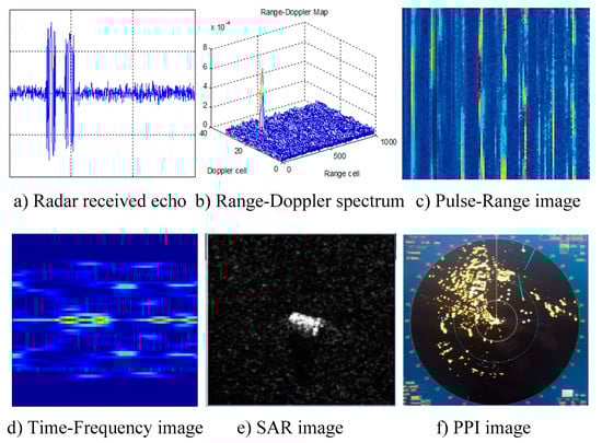 Radar echo is a one-dimensional discrete time sequence, but a radar input data usually includes data of multiple range cells for a certain time, which determines that there are diverse forms of data for the detection network. The accuracy of deep learning also scales with the data. To accomplish this goal, the received radar signals are reshaped as various images to fit the CNN input format. Therefore, in addition to the original radar received signals, most researchers tried to detect and measure targets hidden in the noise background and clutter for multi-dimensional information with multiple CNN models based on range-Doppler spectrums, pulse-range maps, time-frequency images, synthetic aperture radar (SAR) images and plane position indicator (PPI) images as the inputs respectively, listed in Figure 10.