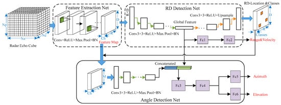 Many studies have concluded that traditional signal processing methods of radar, serving as preprocessing methods of training data, is beneficial to extract features and improve the performance of detection. But actually, as the conventional processing methods, matched filtering and coherent accumulation are essentially convolution computations, and DNN models can extract features from inputs automatically, so it is feasible to detect targets from original radar echoes with DNNs. Jiang et al. [49] proposed a model for RTD based on CNN, which works with radar echo signal directly and therefore avoids the process of conventional signal processing. The proposed model explores the time and frequency domain of radar echo, which is presented in Figure 11. The echo signal is a one-dimensional discrete complex sequence, so the input data should be constructed as a radar echo cube to fit the network. The main goal of RTD is not only to distinguish the target from noise, but also to predict position and velocity. The RD-Detection Net is used to measure range and velocity, while azimuth and elevation are predicted by the Angle-Detection Net. The CNN-based model presented better accuracy and performance of detection than traditional approaches.