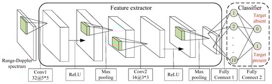 Following the idea of image processing with CNN, a range-Doppler spectrum can be considered as an “image”, then, the detector classifies the “image” as target absent or present, thus, the detection task could be treated as a classification task. Based on this idea, Wang et al. [66] designed a CNN target detector based on the range-Doppler spectrum and compared the proposed method with traditional CFAR detectors. The proposed network architecture presented in Figure 12 is an 8-layer CNN, including 2 convolutional layers, 2 ReLU layers, 2 max-pooling layers, and 2 fully connected layers. Different range-Doppler spectrum with multiple SNR values are constructed as the input of the CNN detector. The detector is actually a sliding window detector that slides over the Range-Doppler spectrum with a fixed window, and further decides whether the spectrum contains targets or just noise.