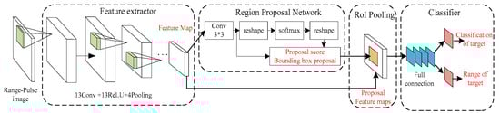 Radar echoes also can be processed as pulse-range two-dimensional images for training and testing. Therefore, the problem of RTD can also be transformed into the target detection and location problem in Pulse-Range images. Pan et al. [69] introduced a CNN model for small marine target detection in strong sea clutter. A modified Faster R-CNN is utilized to extract the features of small targets and sea clutter, then the extracted features are utilized to detect and position the target in the pulse-range image. Figure 13 presents the DNN architecture for RTD based on Faster R-CNN with pulse-range images. This method proved to be easier to use in locating small targets from sea clutter and is able to obtain high obviously, which overcomes the weakness of the traditional CFAR detection methods.