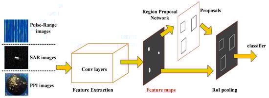 We can find that classic object detection methods based on CNNs, especially Faster R-CNN and SSD, which have been widely employed to RTD. Girshick et al. [92] transformed the detection task into a classification task and proposed Fast R-CNN structure. Ren et al. [93] depicted a new region proposal network (RPN) to implement the end-to-end target detection based on Faster R-CNN and RPN with shared convolutional features [96]. The target detection process of Fast R-CNN is performed in two steps; RPN proposes regions where are easy to find the target. Each region uses anchors to provide its possible course position, and then classifies the proposed target and fine-tunes its position by regression. The structure of Faster R-CNN is presented in Figure 14, and this architecture has been widely used as the basic framework for RTD, not only in Pulse-Range images, but also in SAR images and PPI images.
