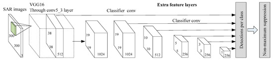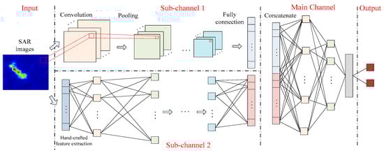CNN is a common deep learning architecture for target detection of SAR images. Wang et al. [74] presented a method and ideas of CNN in the research of target detection in SAR images, laying a foundation for future research. Yang et al. [75] adopted a DNN regression method for SAR images target detection based on the improved structure of YOLO [94]. This network is effective for extracting features with low resolution and complex composition. Zheng et al. [76] proposed a multi-feature target detection method in SAR imagers aiming at obtaining the target’s actual position, which is presented in Figure 15. The CNN model was applied to capture deep features while the ANN was adopted to analyze hand-crafted features. Then, two sub-channel features are concatenated together in the main channel and the experimental results showed that the multi-features-based method outperformed other methods.