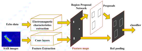 In addition, Faster R-CNN [93] was modified to improve detection performance in SAR images. Kang et al. [70] introduced a CNN-based detection method combining features and pixels in which the Faster R-CNN framework was modified by the traditional CFAR detection algorithm for small-sized targets detection, which is presented in Figure 16. For targets with clearer shape and structure, Faster R-CNN gave higher classification scores, while for those small-sized targets with smaller bounding boxes, the classification score was relatively low. CFAR was employed because this detector relies on the amplitude of the pixel rather than the shape or structure of the target. The combination of detectors based on deep features and pixels can improve the multi-scale target’s detection performance. An SAR image is different from an optical image in that it reflects the electromagnetic characteristics of the target. Making full use of electromagnetic characteristics in feature extraction for RTD would help improve detection performance. Zhang et al. [77] fused electromagnetic and geometrical characteristics and involved the fused features in Faster R-CNN, and the architecture is presented in Figure 17. in their work, convolutional layers were utilized to extract geometric features of SAR images, just like the process of optical images. Meanwhile, SVM was applied to extract electromagnetic characteristics from the complex data.