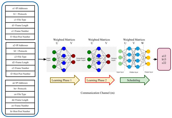 Input = [a1 to f1, a2 to f2 ….an to fn] signifies the system state’s information, and a + b indicates the neuron number in the layer. The output layer representing the information of the selection action is illustrated in Figure 2, which contains the channel (m) in communication mode j and buffer k with a + b + J neurons. The hidden layer is composed of several layers, and the number of neurons is estimated using Equations (1) and (2):