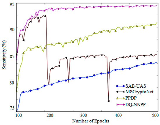Figure 5 illustrates the comparison of sensitivity between the SAB-UAS, MSCryptoNet, and PPDP methods, and the proposed DQ-NNPP method. The Xaxis presents the number of epochs utilized for the examination, and the Yaxis shows the sensitivity values acquired in percentages. The SAB-UAS, MSCryptoNet, and PPDP methods achieved sensitivity of 79.4%, 84.72%, and 86.42%, respectively. Comparatively, the proposed DQ-NNPP method achieved 92% sensitivity, which was 13.4%, 8.72%, and 6.42% better than those of SAB-UAS, MSCryptoNet, and PPDP, respectively.
