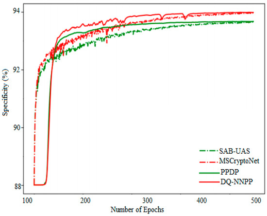 Figure 6 compares the specificity of the existing SAB-UAS, MSCryptoNet, and PPDP methods, and of the proposed DQ-NNPPmethod, where the number of epochs used for analysis is given on the Xaxis, and specificity values obtained in percentages are on the Yaxis. The existing SAB-UAS, MSCryptoNet, and PPDP methods achieved specificity of 90.7%, 91.44%, and 91.58%, respectively. In comparison, the proposed DQ-NNPP method achieved 92.1% specificity, which was2.6% better than that ofSAB-UAS, 1.34% better than that of MSCryptoNet, and 1.48% better than that of the PPDP method.