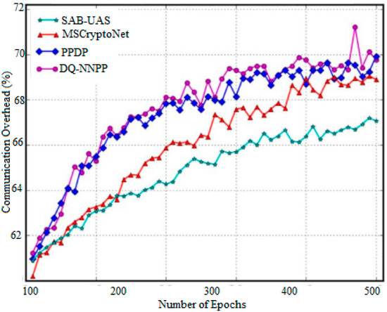 Figure 7 illustrates the comparison of communication overhead between SAB-UAS, MSCryptoNet, PPDP, and the proposed DQ-NNPP method. The Xaxis displays the number of epochs utilized for analysis, and the Yaxis gives the communication overhead values obtained in percentages. The SAB-UAS, MSCryptoNet, and PPDP methods achieved a communication overhead 64.62%,65.24%, and 66.76%,respectively. In comparison, the proposed DQ-NNPP method achieved67.08% communication overhead, which was3.04%, 2.24%, and 2.3% better than those of the SAB-UAS, MSCryptoNet, and PPDP methods, respectively.