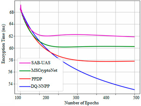 Figure 8 presents the encryption time comparison between the existing methods and the proposed method, in which the number of epochs used for analysis is given on the Xaxis, and the encryption time values in milliseconds are on the Yaxis. When compared, the existing SAB-UAS, MSCryptoNet, and PPDP methods achieved encryption times of 64, 62.2, and 60.52 ms, respectively. Comparatively, the proposed DQ-NNPP method achieved an encryption time of 58.72 ms, which was 6.72, 4.4, and 2.3 ms faster than those of the SAB-UAS, MSCryptoNet, and PPDP methods, respectively.
