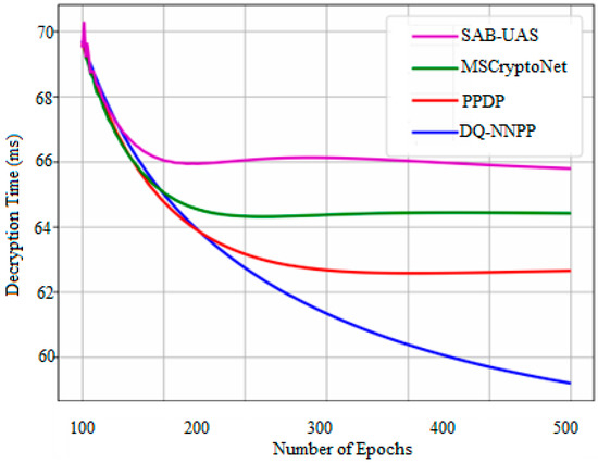 Figure 9 presents the decryption time comparison between the existing SAB-UAS, MSCryptoNet, and PPDP methods, and the proposed DQ-NNPP method. The Xaxis displays the number of epochs used for analysis, and the Yaxis gives the decryption time values obtained in milliseconds. The existing SAB-UAS, MSCryptoNet, and PPDP methods achieved decryption times of 67.48, 66.58, and 64.74, respectively. In comparison, the proposed DQ-NNPP method achieved a decryption time of 62.72 ms, which was 5.36 ms faster than that of SAB-UAS, 4.5 ms faster than that of MSCryptoNet, and 2.02 ms faster than that of the PPDP method. Table 1 provides the overall comparative analysis ofall methods.