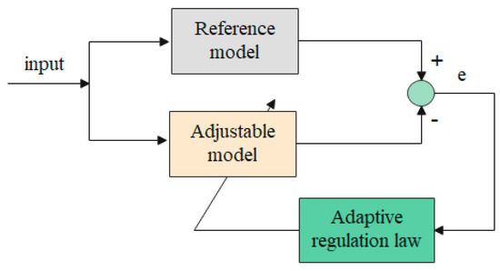 The structure of a typical model reference adaptive system algorithm (MRAS) system consists of 3 parts: the reference model, the variable model, and the adaptive law (where the model containing the parameters to be estimated is treated as a variable model). By constructing two models with the same output quantity, when the comparison of the adjustable model and the reference model produces error values, the difference is corrected by using the adaptive parameter law. Finally, the same control output of the adjustable model and the reference model can be obtained [29,30]. Its schematic block diagram is shown in Figure 1.
