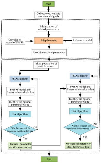 The principle and flow of multiparameter identification of a PMSM based on MRAS-SAPSO are shown in Figure 2 and Figure 3, respectively.