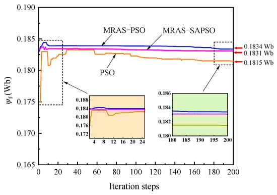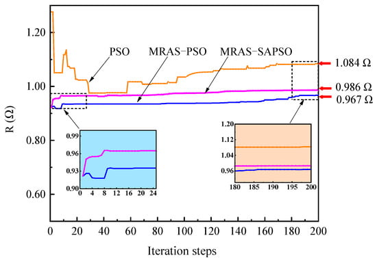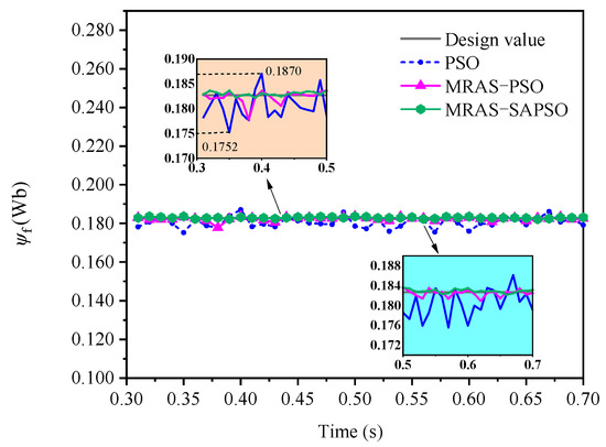 Comparing Table 3, Table 4 and Table 5, from the results of the three algorithm identifications, the highest identification accuracy of magnetic linkage and the lowest accuracy of stator winding resistance can be observed. The reason for this is that the fluctuation in the value of magnetic linkage has the strongest influence on the value of the fitness function, and the value of resistance has the lowest influence on it. The aim of PSO is to find the solution vector with the smallest fitness value. In other words, the solution vector that has the strongest impact on the fitness value tends to achieve the highest discrimination accuracy. This parameter identification law is the same as the one derived in the literature [37]. The resistance and damping coefficients identified based on the PSO algorithm fluctuated the most, with fluctuation deviations of 0.723 Ω and 4.638 N·m·s, respectively. The errors between the mean and true values of the identification results were 16.04% and 10.73%, respectively. This indicated that the single PSO algorithm is more influenced by the initial value of particles and the randomness of particles in the process of finding the optimum, which leads to the poor stability of the final identification results and low accuracy at convergence. The mean errors of the parameters identified based on MRAS-PSO and MRAS-SAPSO algorithms were less than 2%. The deviation in the parameter fluctuation identified by the MRAS-SAPSO algorithm was significantly smaller than that of the MRAS-PSO algorithm, which further showed that the MRAS-SAPSO algorithm has the best performance, and the algorithm dramatically improves the accuracy and reliability of PMSM parameter identification results.