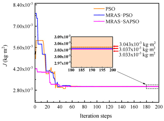 From the data in Table 2, it can be seen that the deviations between the identified values of several parameters based on the MRAS-SAPSO algorithm and the true values were minimal, and none of the maximum deviations exceeded 2%. Among the five identification parameters, the identification accuracy of electrical parameters (stator winding resistance, inductance, magnetic linkage) was higher than that of mechanical parameters (moment of inertia and viscous damping coefficient). Analysis showed that reason for this finding is that the MRAS algorithm parameter identification of the three electrical parameters of stator resistance, inductance, and magnetic chain, and the results as the initial particle swarm of the SAPSO algorithm, to a certain extent, o reduce the scope of the particle swarm seeking, and improve the speed and accuracy of the particle seeking. At the same time, the SA algorithm optimizes the obtained optimal particle again to avoid the optimal particle being a local optimal solution. As a result, the identified parameters converge faster and with higher accuracy.