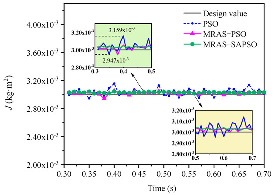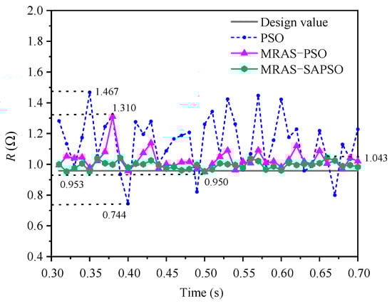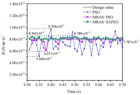 As can be seen from Figure 9, Figure 10, Figure 11, Figure 12 and Figure 13, at 0.3–0.7 s, the results of the multiparameter identification of PMSM based on the MRAS-SAPSO algorithm showed the smallest fluctuations and the closest approximation to the true value compared to the identification results based on the PSO and MRAS-PSO algorithms. The PSO-algorithm-based PMSM parameter identification had the worst effect. The parameter values identified in adjacent time periods fluctuated the most, amongst which the identification curves of the resistance and damping coefficient fluctuated the most significantly. In order to quantitatively analyze the performance of the three algorithms in this time period of the recognition results, we defined the fluctuation deviation ∆x = xmax − xmin, where x is the average value of the recognition results in this time period and δ is the deviation between the average value of the recognition results and the true value in this time period. The results are shown in Table 3, Table 4 and Table 5.