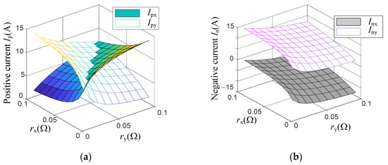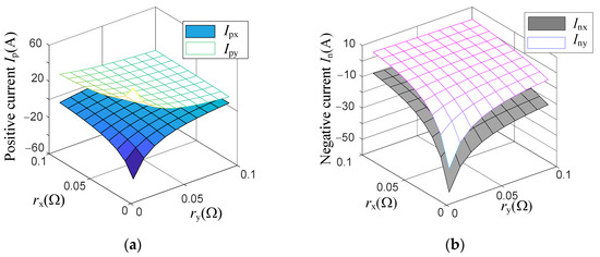 The specific effects of the duty cycles, line resistance and load resistance on the positive and negative line currents could be obtained from Equation (3) by setting the value range of both rx and ry to [0.01–0.1] Ω. The rated value of the voltage uref was 30 V, and the load resistance Rp and Rn were both 1 Ω. When D1 and D2 were not equal (setting D1 = 0.45, D2 = 0.55), the variation curve of the positive and negative DC bus currents of node 1 and node 2 could be obtained according to Equation (3). The results are presented in Figure 5.