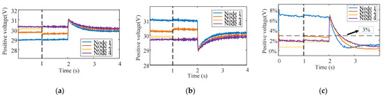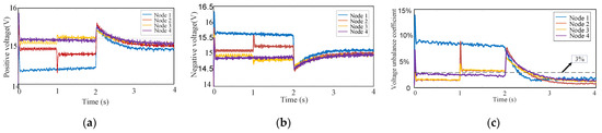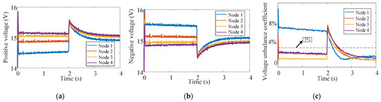 It can be seen from Figure 10 that during 0~2 s, due to the influence of the line resistance and load resistance in the multi-node bipolar DC distribution network system, the positive and negative DC bus voltage of each node would deviate from the rated value of 15 V. By adopting the discussion of the voltage unbalance coefficient in Section 2, it was concluded that the sum of the voltage unbalance coefficients of the four nodes was larger than the rated value (12%):