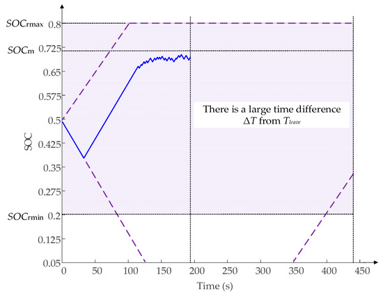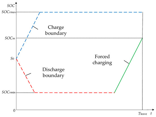 Therefore, for EVs in the station, the SOC can be maintained within the range of [SOCrmin, SOCrmax]. SOCrmax and SOCrmin are the recommended maximum and minimum value of SOC, which can ensure the life of the battery. To satisfy the sufficient SOCm to make sure the follow-up driving when EVs leave, the constraint conditions are added to the SOC of EVs, as shown in Figure 1. The blue dotted line represents the charge boundary, which means that the EV can no longer charge when the SOC reaches SOCrmax. The red dotted line represents the discharge boundary, which means that the EV can no longer discharge when the SOC reaches SOCrmin. The solid green line represents the boundary of forced charging, which means that the EV is forced to charge to ensure the SOCm when leaving the charging station.