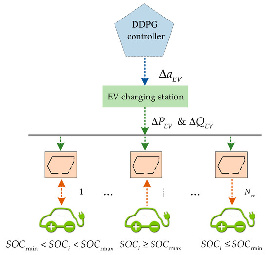 Furthermore, in terms of active power, the rated charging power of a single EV can be set to and the rated discharging power to The relationship between the charging power of a single EV and the charging and discharging state can be obtained as follows: When SOCi ≥ SOCrmax, the single EV can discharge positive power increment 0 < ΔPEV,I < , which can ensure that SOCi is controlled below SOCrmax. When SOCi ≤ SOCmin, the single EV can only be charged, that is, only the negative power increment can be discharged0, which can ensure that SOCi is controlled above SOCrmin. When SOCrmin < SOCi < SOCrmax, the single EV can be charged and discharged. Thus, the power increment satisfies . In summary, the instruction distribution of the EVs station through the controller is shown in Figure 2. In addition, the charging and discharging constraint boundary of a single EV can be obtained as follows: